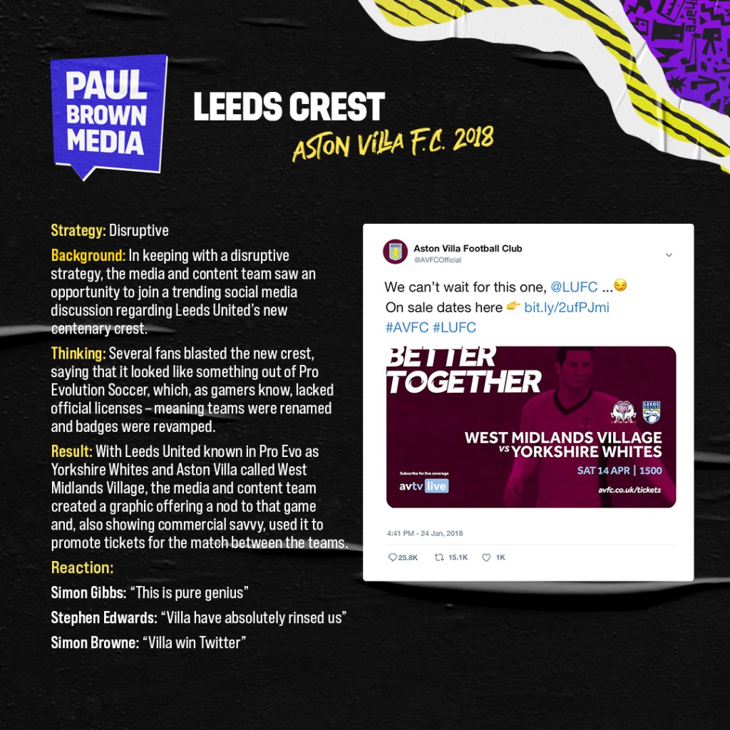In keeping with a brave, disruptive, entertaining strategy, Aston Villa’s media and content team saw an opportunity to join a trending social media discussion regarding Leeds United’s new centenary crest.